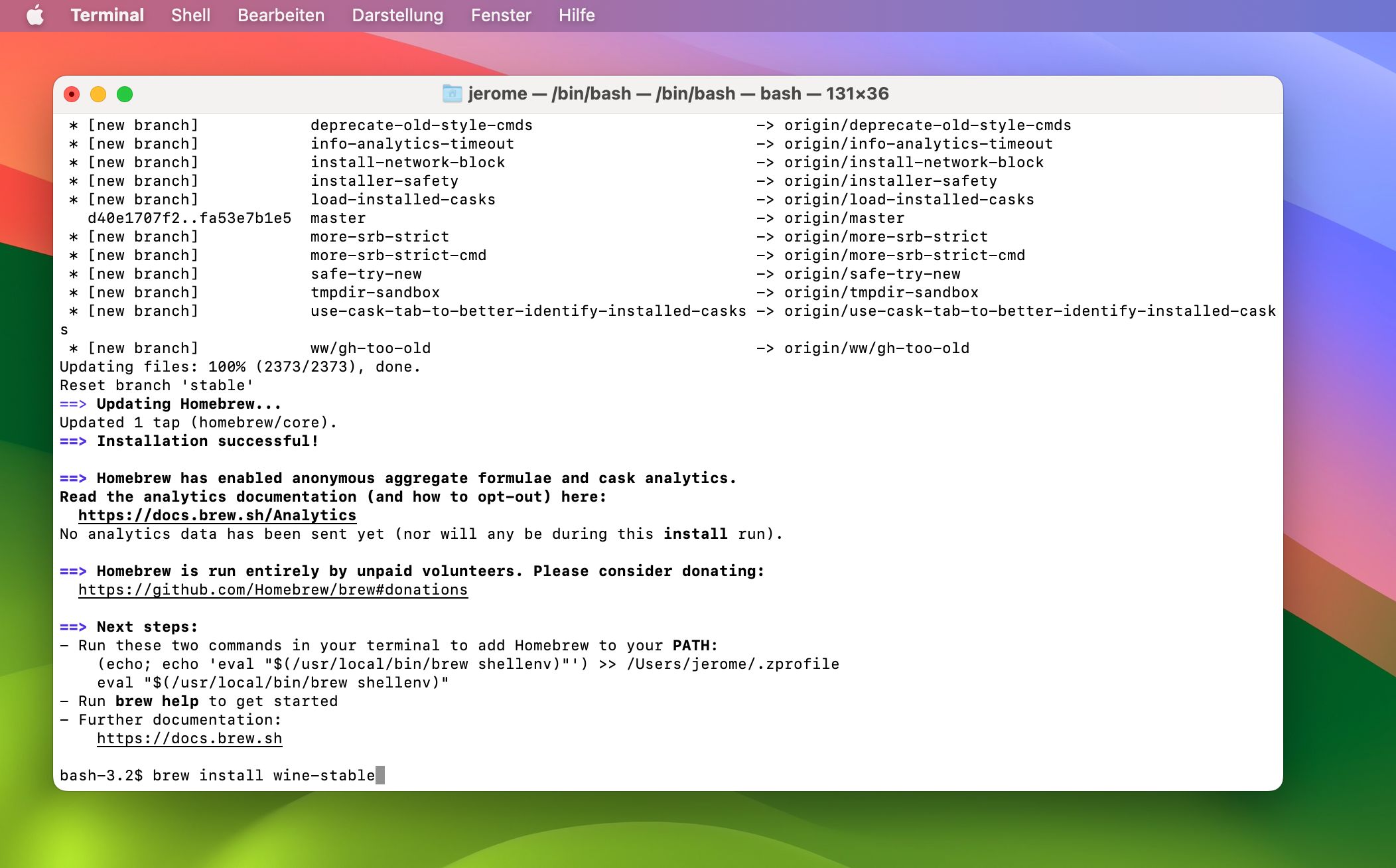 Homebrew wird euch fragen, ob ihr okay damit seid, dass es installiert wird. Einfach weiter Enter drücken, bis es tatsächlich installiert ist (und nicht von dem ganzen Text abschrecken lassen). Ist das geschafft, können wir ganz einfach Wine mittels Homebrew installieren. Dazu geben wir folgenden Befehl im Terminal ein: