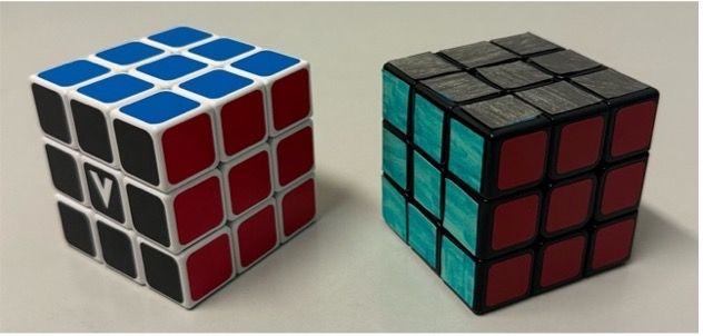 In parallel, we set up a human experiment to compare with our AI results, with people experienced as well as unexperienced in solving the Rubik's cube. We created two versions of the cube - a regular one and a modified version where we replaced the blue stickers with black ones using colored paper.
